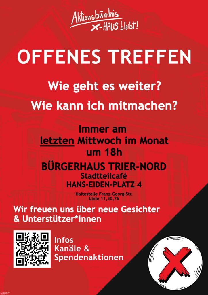 Jeden letzten Mittwoch im Monat um 18 Uhr findet im Stadtteilcafé im Bürgerhaus Trier-Nord (Hans-Eiden-Platz 4) das Offene Treffen des Aktionsbündnis eXhaus bleibt! statt. Kommt vorbei, informiert Euch über das Aktionsbündnis und die eXhaus-Genossenschaft